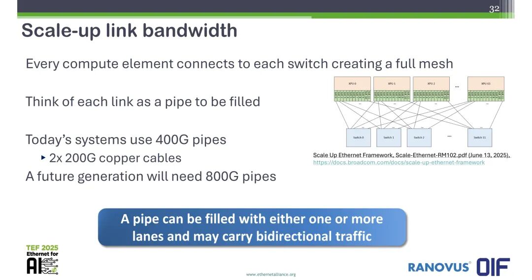 从带宽需求来看,全mesh互连架构下,每个计算单元都与每个交换机连接,当前系统采用400G的链路管道,由2条200G铜缆实现,下一代系统将需要800G的链路管道,单条管道可由单通道或多通道承载,可支持双向流量。