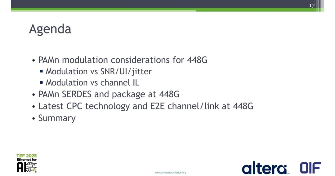 Mike Li的分享围绕448G的PAMn调制特性、SERDES与封装技术、CPC信道仿真结果、核心参数定义展开。