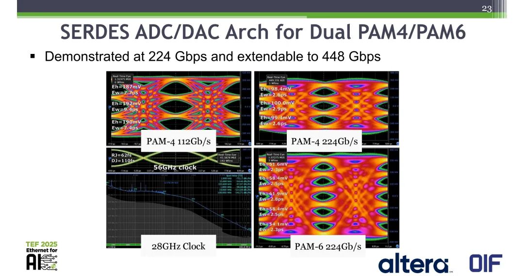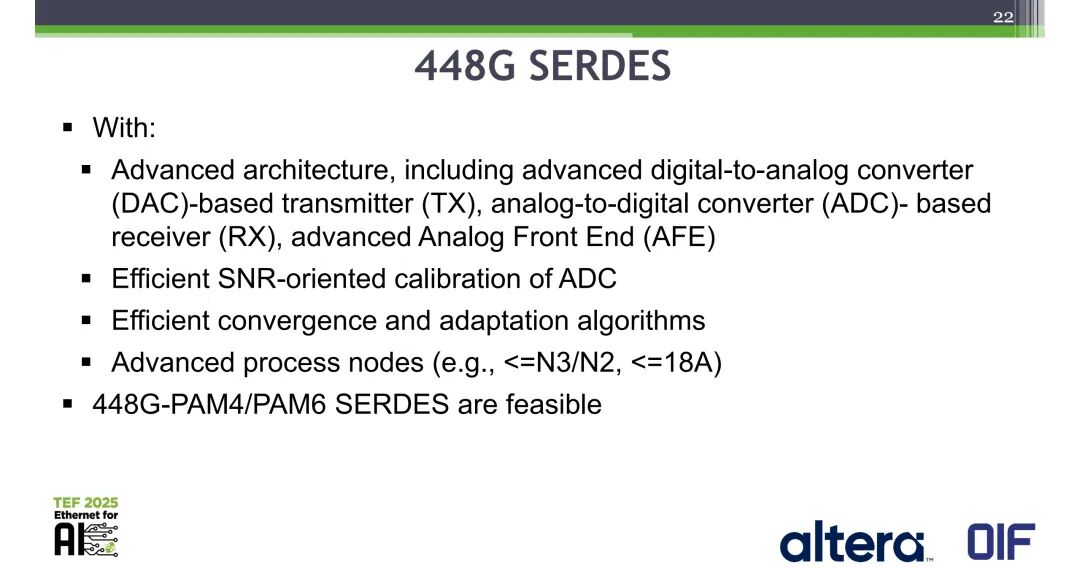 基于先进架构(包括DAC基发射机、ADC基接收机、先进模拟前端AFE)、高效的ADC SNR导向校准、高效的收敛与自适应算法,结合先进工艺节点(如≤N3/N2、≤18A),448G-PAM4/PAM6 SERDES具备技术可行性。同时,在224Gbps速率下验证的双PAM4/PAM6 SERDES ADC/DAC架构,可直接扩展至448Gbps速率。