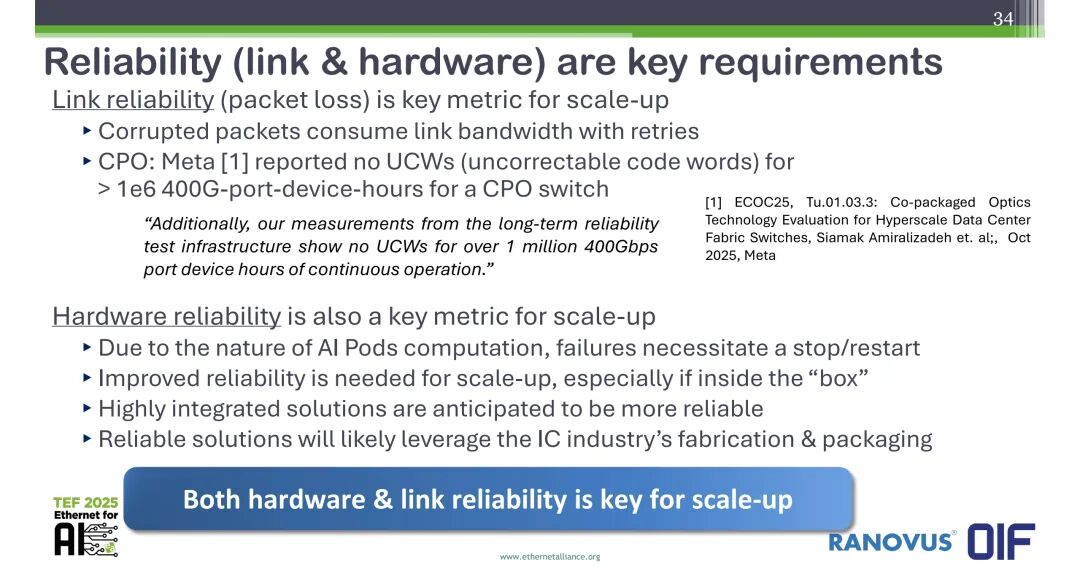 可靠性方面,链路可靠性(丢包)是Scale-Up的核心指标,损坏的数据包会导致重传,占用链路带宽;Meta在ECOC25上发布的测试数据显示,其CPO交换机在超过1e6小时的400G端口设备连续运行中,未出现任何不可纠正码字(UCW),验证了CPO方案的高可靠性。硬件可靠性同样是核心指标,AI集群的计算特性决定了硬件故障会导致训练任务的停止与重启,Scale-Up场景对硬件可靠性的要求更高,尤其是“机箱内”的设备,高集成度方案预计具备更高的可靠性,可靠的方案将依托IC行业的成熟制造与封装能力。