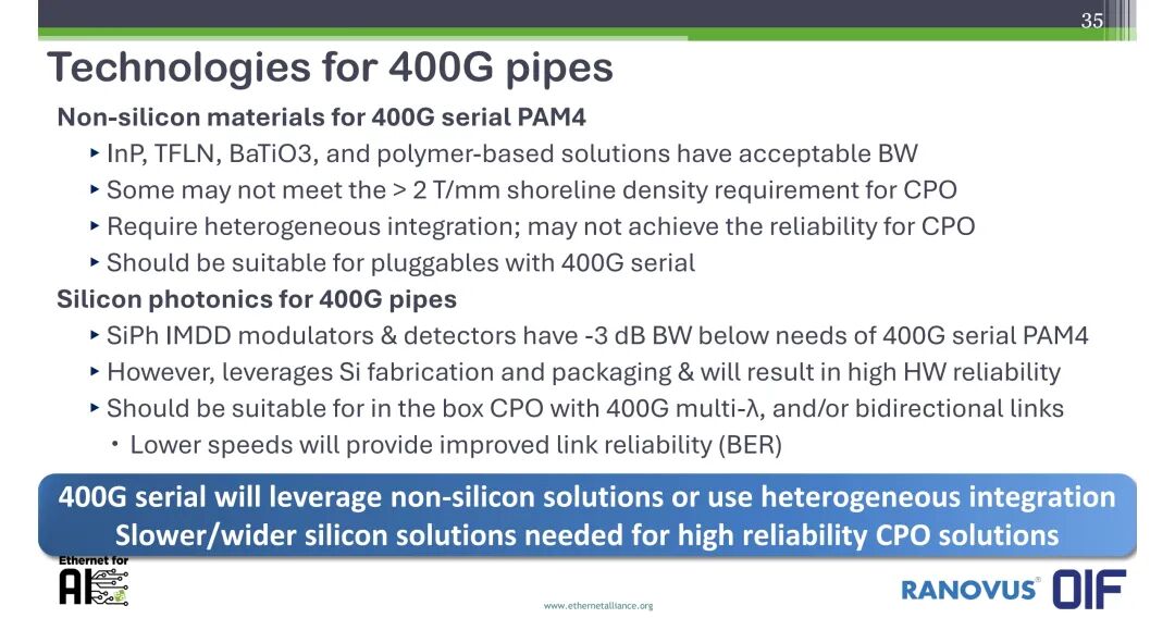 - 硅光方案:IMDD调制器与探测器的-3dB带宽无法满足400G串行PAM4的需求,但可依托成熟的硅制造与封装工艺,实现更高的硬件可靠性,适合采用多波长、双向链路的机箱内CPO场景,更低的单波长速率可实现更优的链路误码率(BER)。
