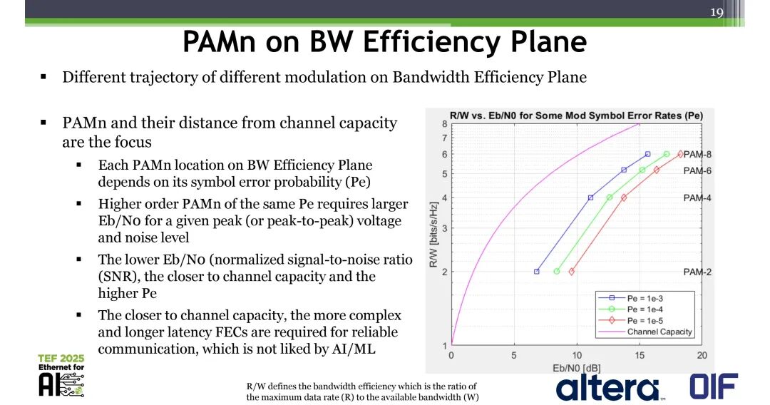 从带宽效率来看,不同调制在带宽效率平面上有不同的轨迹,PAMn与信道容量的距离是核心关注点,其在带宽效率平面上的位置取决于符号错误概率(Pe)。相同Pe下,更高阶的PAMn需要更大的归一化信噪比Eb/N0;而Eb/N0越低,距离信道容量越近,Pe越高,同时需要更复杂、时延更长的FEC来实现可靠通信,这与AI/ML场景的低时延需求相悖。
