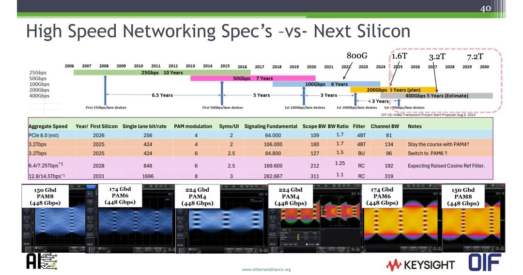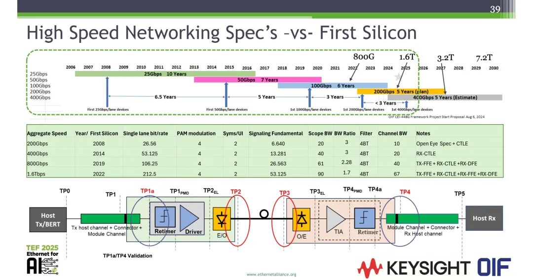 单通道速率的提升持续加快技术迭代节奏:单通道速率从25Gbps到50Gbps的落地间隔为10年,50Gbps到100Gbps为6.5年,100Gbps到200Gbps为5年,200Gbps到400Gbps缩短至3年。OIF CEI-448G框架项目于2024年8月启动,对测试测量技术提出了更高的要求。