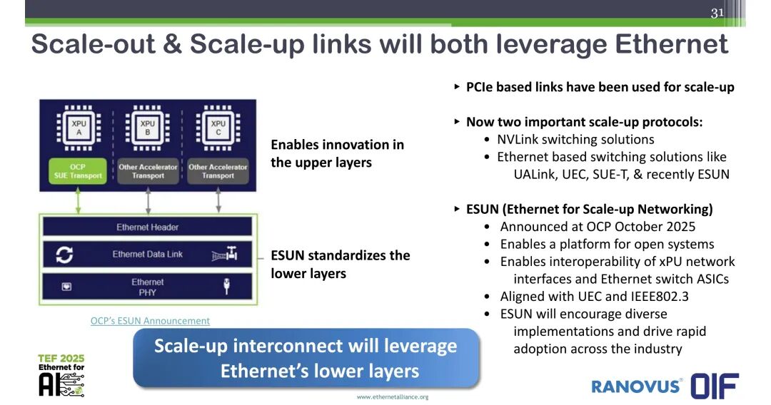 其中,ESUN(Ethernet for Scale-up Networking)于2025年10月在OCP大会上发布,为开放系统提供了平台,可实现xPU网络接口与以太网交换机ASIC的互操作性,与UEC、IEEE802.3标准对齐,将推动多样化的实现方案,加速全行业的规模化应用。以太网的底层标准化可支撑上层协议的创新,同时实现不同厂商设备的互操作。