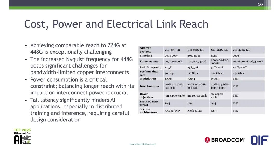 在448G速率下实现与224G相当的传输距离极具挑战,448G提升的奈奎斯特频率对带宽受限的铜互连带来了显著的物理约束。功耗是AI集群的核心刚性约束,长距离传输将直接推高互连功耗,需要在传输距离与功耗之间实现精准平衡;同时,尾时延会严重影响AI应用,尤其是分布式训练与推理场景,需要在设计中重点考量。