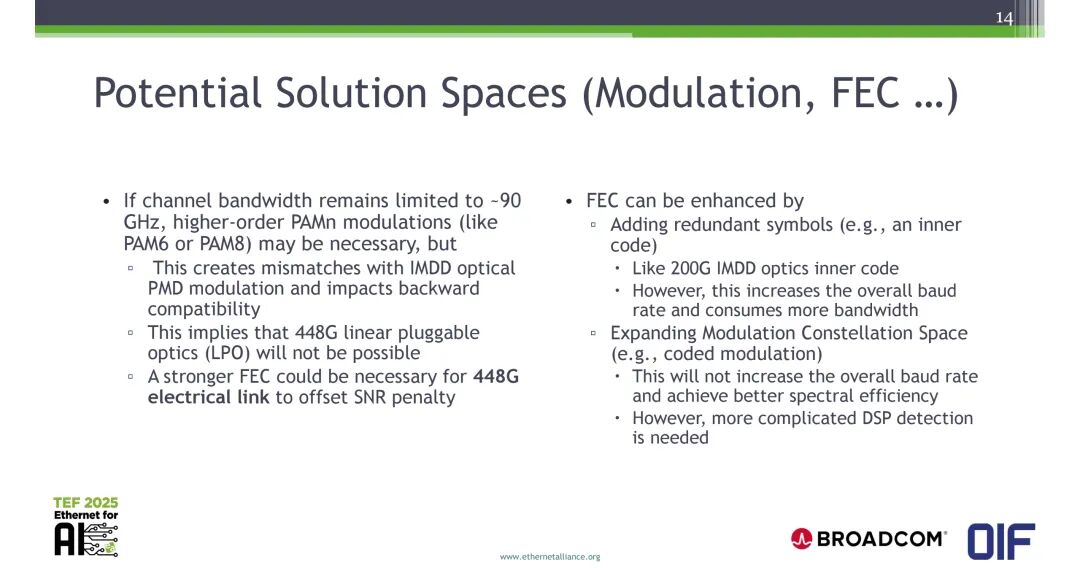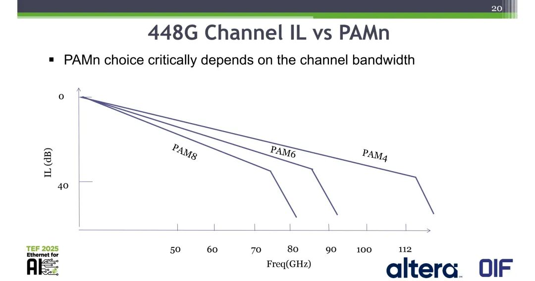 如果信道带宽仍限制在约90GHz,可能需要采用PAM6、PAM8等高阶PAMn调制,但该方案存在三大核心问题:一是与IMDD光PMD调制不匹配,影响向后兼容性;二是448G线性可插拔光(LPO)将无法实现;三是需要更强的前向纠错(FEC)技术来补偿SNR损失。