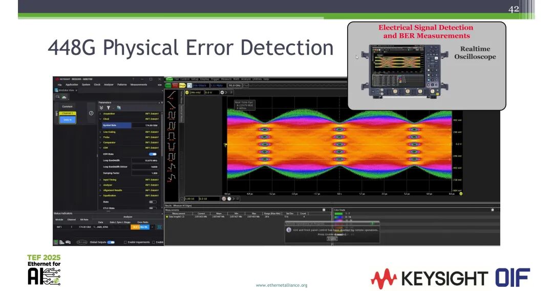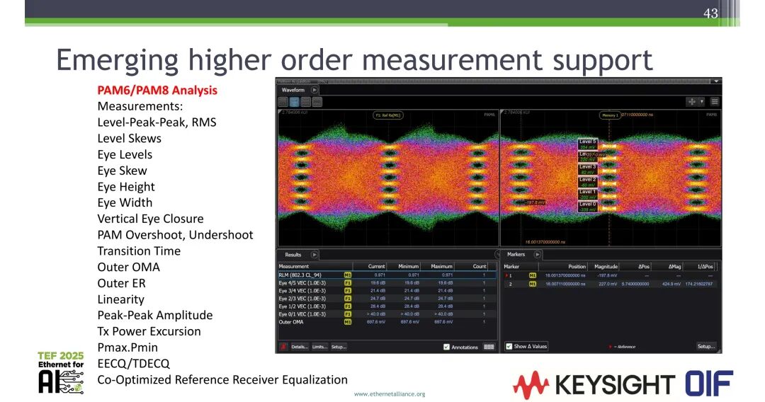 针对448G的电信号检测与BER测量,当前已具备完整的测试能力:实时示波器可支持448G物理层误码检测;针对高阶PAMn调制,已实现完整的PAM6/PAM8信号分析能力,可测量的参数包括电平峰峰值、RMS、电平偏斜、眼图电平、眼图偏斜、眼高、眼宽、垂直眼图闭合、PAM过冲/下冲、转换时间、外OMA、外消光比、线性度、峰峰值幅度、Tx功率偏移、EECQ/TDECQ,同时支持协同优化的参考接收机均衡功能。