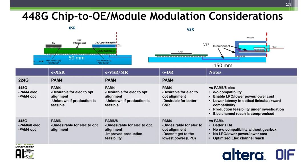 - 448G PAM4电+PAM4光方案:全场景均可实现电光调制对齐,支持LPO架构,实现更低的功耗、成本与光链路时延,同时具备向后兼容性,但量产可行性仍在研究中,且会压缩电信道的传输距离;