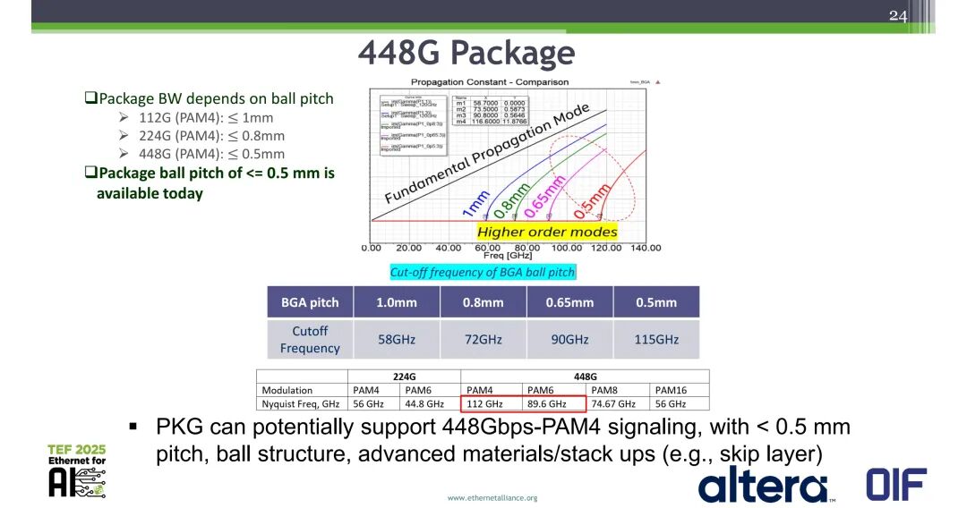 封装技术方面,封装带宽核心取决于BGA球间距:>112G PAM4需要≤1mm球间距,>224G PAM4需要≤0.8mm球间距,>448G PAM4需要≤0.5mm球间距,目前≤0.5mm的BGA球间距技术已可实现。不同球间距对应的截止频率为:1.0mm球间距58GHz,0.8mm 72GHz,0.65mm 90GHz,0.5mm 115GHz,刚好满足448G PAM4的112GHz奈奎斯特频率需求。结合先进材料、堆叠设计(如skip layer),<0.5mm间距的封装可稳定支持448Gbps-PAM4信号传输。