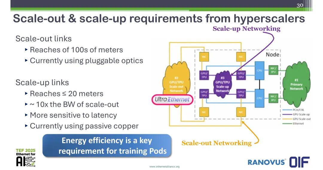 - Scale-Out(横向扩展)场景:当前节点规模10万以上,物理范围为数据中心级,主要互连方式为光互连;下一代节点规模将进一步突破,对大规模互连的带宽密度提出更高要求。