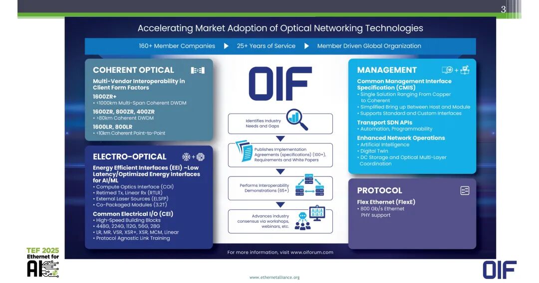 OIF是拥有25年以上行业服务经验、由160余家成员企业组成的全球会员驱动型组织,核心使命是加速光网络技术的市场应用,核心工作包括识别行业需求与技术缺口、发布超100项实施协议(IA)、需求文档与白皮书、完成超65项互操作性演示,通过研讨会、线上研讨会等形式推动产业共识形成。