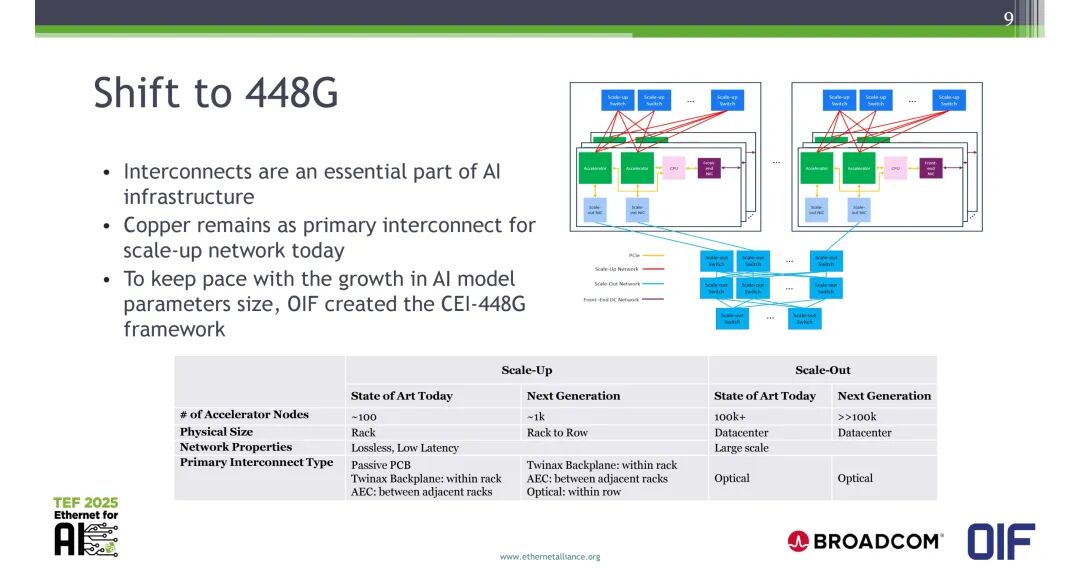 - Scale-Up场景:当前加速器节点规模约100个,物理范围为机架内,网络要求无损、低时延,主要互连方式为无源PCB、双轴背板(机架内)、AEC(相邻机架);下一代节点规模将达到约1000个,物理范围扩展至机架到行级,延续现有铜互连方式的同时,将在行内引入光互连。