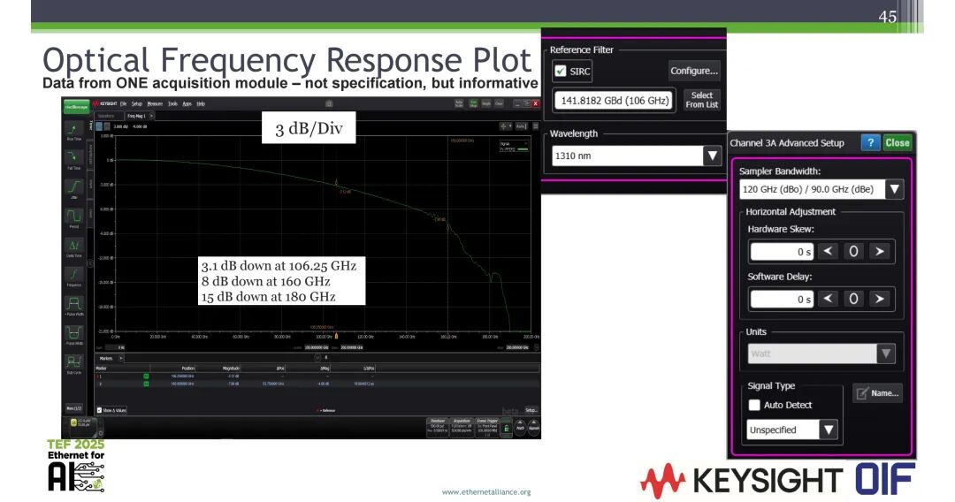 - 12.8/14.5Tbps(2031年):单通道1696Gbps,PAM8调制,所需示波器带宽311GHz,带宽比1.1。