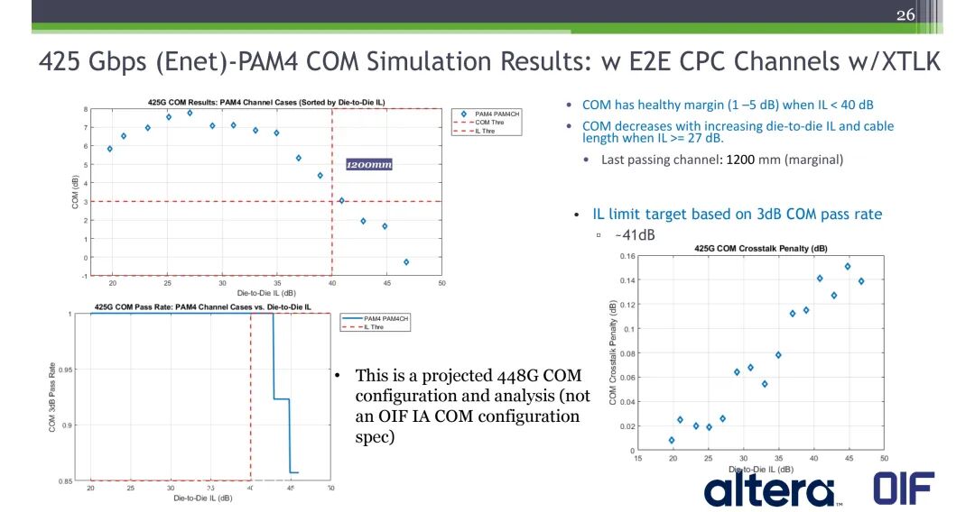 本次分享披露了基于31AWG线缆与Luxshare CPC连接器的448G电电缆链路系统仿真结果:端到端链路包含host芯片、封装、PCB、CPC连接器、线缆、对端CPC连接器、PCB、封装、host芯片,425Gbps(以太网速率)PAM4信号在含串扰的端到端CPC信道下,当插入损耗<40dB时,组件(COM)具备1-5dB的健康余量;当插入损耗≥27dB时,COM性能随插入损耗与线缆长度的增加而下降;最后一个可通过的信道长度为1200mm(余量有限);基于3dB COM通过率的插入损耗阈值约为41dB。