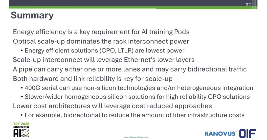 Jeff Hutchins在分享最后给出了结论:能效是AI训练集群的核心需求,Scale-Up光互连主导了机架内互连的功耗,CPO、LTLR等能效方案的功耗最低;Scale-Up互连将采用以太网的底层架构;单条链路管道可由单通道或多通道承载,可支持双向流量;硬件与链路可靠性是Scale-Up场景的核心要求,400G串行链路可采用非硅技术或异质集成方案,高可靠性CPO方案需要采用速率更低、通道更宽的同质硅方案;低成本架构将采用成本优化的光方案,例如通过单纤双向技术降低光纤基础设施成本。