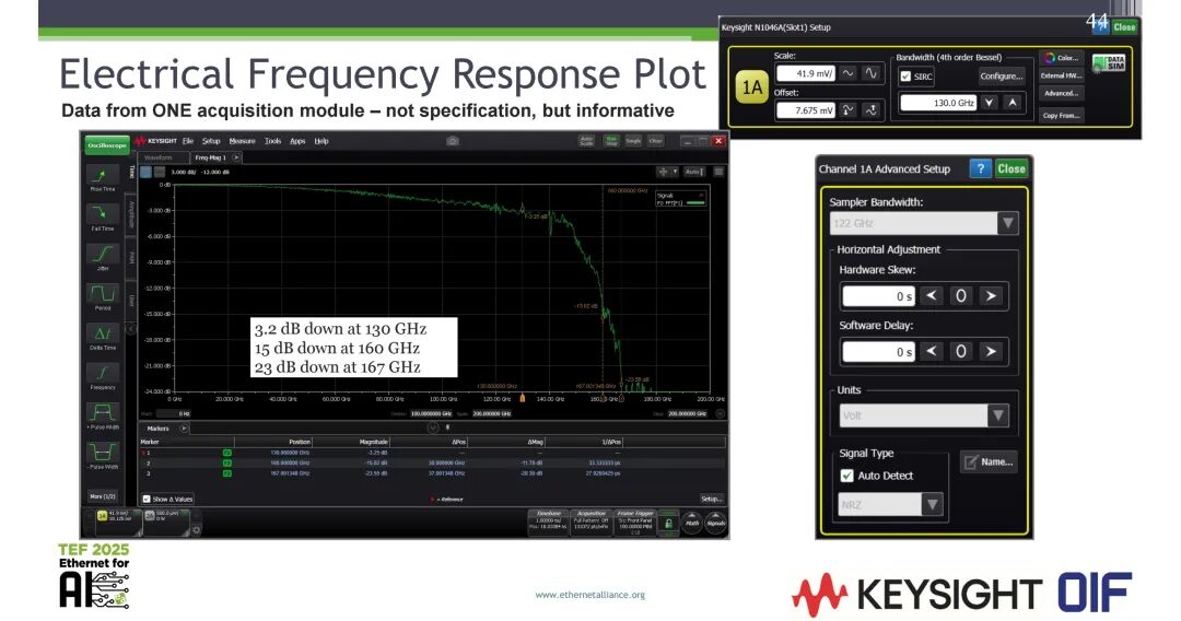 测试仪器的带宽性能已可满足448G场景的需求:电通道测试方面,当前的测试采集模块可实现130GHz频率下3.2dB的幅度衰减,160GHz频率下15dB的衰减,167GHz频率下23dB的衰减;光通道测试方面,可实现106.25GHz下3.1dB的衰减,160GHz下8dB的衰减,180GHz下15dB的衰减。