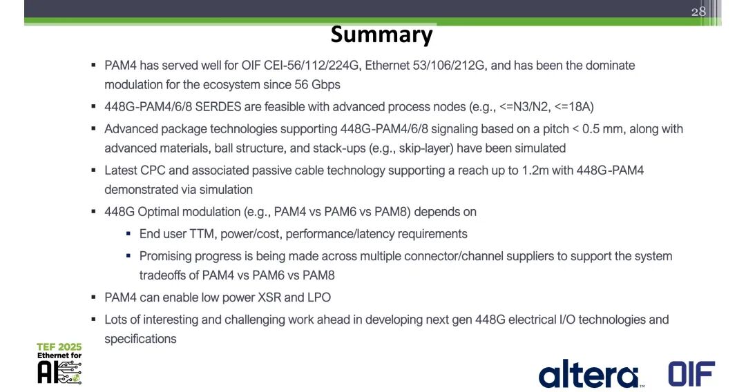 Mike Li在分享最后给出了产业共识:PAM4调制在OIF CEI-56/112/224G、以太网53/106/212G标准中得到了广泛应用,自56Gbps以来一直是生态系统的主导调制格式;基于先进工艺节点,448G-PAM4/6/8 SERDES具备技术可行性;<0.5mm球间距的先进封装技术可支持448G-PAM4/6/8信号传输,相关仿真已完成;基于最新CPC与配套无源线缆技术,仿真验证了448G-PAM4可实现最长1.2m的传输距离;448G的最优调制格式取决于终端用户的上市时间、功耗/成本、性能/时延需求,多家连接器与信道供应商已取得积极进展,可支撑PAM4与PAM6/PAM8的系统权衡;PAM4可实现低功耗的XSR与LPO方案;下一代448G电气I/O技术与规范的开发仍有大量具有挑战性的工作需要完成。
