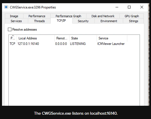 CWGService.exe (ICMViewer Launcher):一个 Windows 服务,监听本地主机端口 localhost:16140,并等待命令以适当参数启动 ICM Viewer,例如 JWT 令牌、语言等。启动 Viewer 的命令通过点击 Web Portal 上的 “Run Viewer” 按钮来完成。