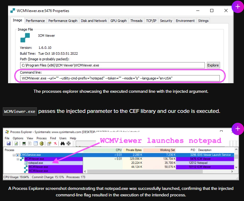 如前所述,WCMViewer.exe 是一个基于 Chromium 的应用程序,它使用了 CEF 库,允许在应用程序中直接嵌入 Chromium 浏览器。这带来了一个有趣的问题:WCMViewer.exe 是否会接受除预期参数之外的额外 Chromium 命令行标志?