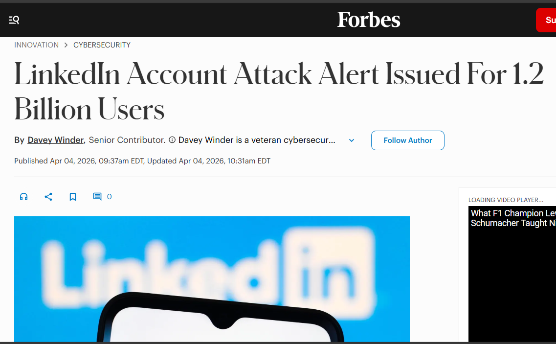 全球职业社交平台已成为职场沟通、商务协作、人才流动的关键数字基础设施,其承载的真实身份、企业关系、商业信息具有极高安全价值,长期成为网络黑产与定向攻击的核心目标。2026 年 4 月,多家国际安全机构与科技媒体发布预警,LinkedIn 平台出现覆盖海量用户的账户攻击活动,攻击者综合运用社交工程诱骗、前端脚本扫描、恶意链接投放、会话劫持等手段,大规模窃取用户凭证与敏感信息,对个人与组织安全造成持续威胁微博。