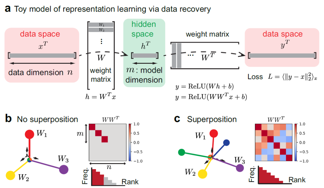 任务定义: 模型目标是将高维特征向量 (代表输入数据,如文本中的token)压缩为低维隐藏表征 (其中 ),然后重建回原始特征,最小化重建损失 。这模拟了LLM的“token嵌入→隐藏表征→输出预测”过程。具体架构如图2a所示:输入 通过权重矩阵 映射到隐藏层 ,然后通过ReLU激活函数输出重建 ,损失函数为 ( 表示对数据分布取平均)。