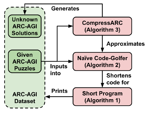 论文图2.该图展示了 CompressARC 的核心哲学,即通过近似一种特定的压缩算法,将整个 ARC-AGI 谜题数据集转换为一个能够精确打印出所有已知网格的最短程序 。基于奥卡姆剃刀原理,模型假设这个最短的程序必然捕获了谜题背后的本质规律,因此当该程序运行并输出那些未知的测试答案时,这些打印出的结果被认为是真实解的最佳预测 。这一流程将传统的逻辑搜索问题巧妙地转化为一个寻找最优压缩表现的优化过程,通过追求极简的代码表达来实现强大的泛化推理。