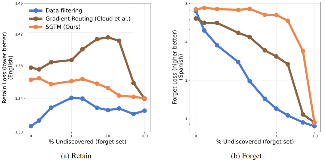 - 鲁棒性:当漏标率从 0% 增加到 40% 时,Data Filtering 的遗忘效果(Forget Loss)迅速恶化(因为模型从未标记数据中学到了西班牙语);而 SGTM 的遗忘效果保持稳定。