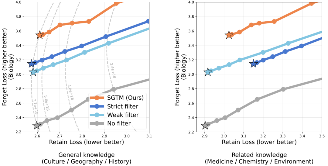 X轴:显示保留损失(非生物学主题),数值越低表示通用能力保留越好。 每条线代表一次训练运行的进度,每个点是以相等间隔记录的检查点。星号表示最终检查点。虚线显示了相等的计算支出(FLOPs,右图未显示)。 结论:在通用知识(左图)和生物学邻近知识(右图)上,SGTM 在任何给定的保留损失值下都产生了更高的遗忘损失。不过,SGTM 会产生一定的计算效率惩罚,需要更多的计算量才能达到相同的保留损失值。