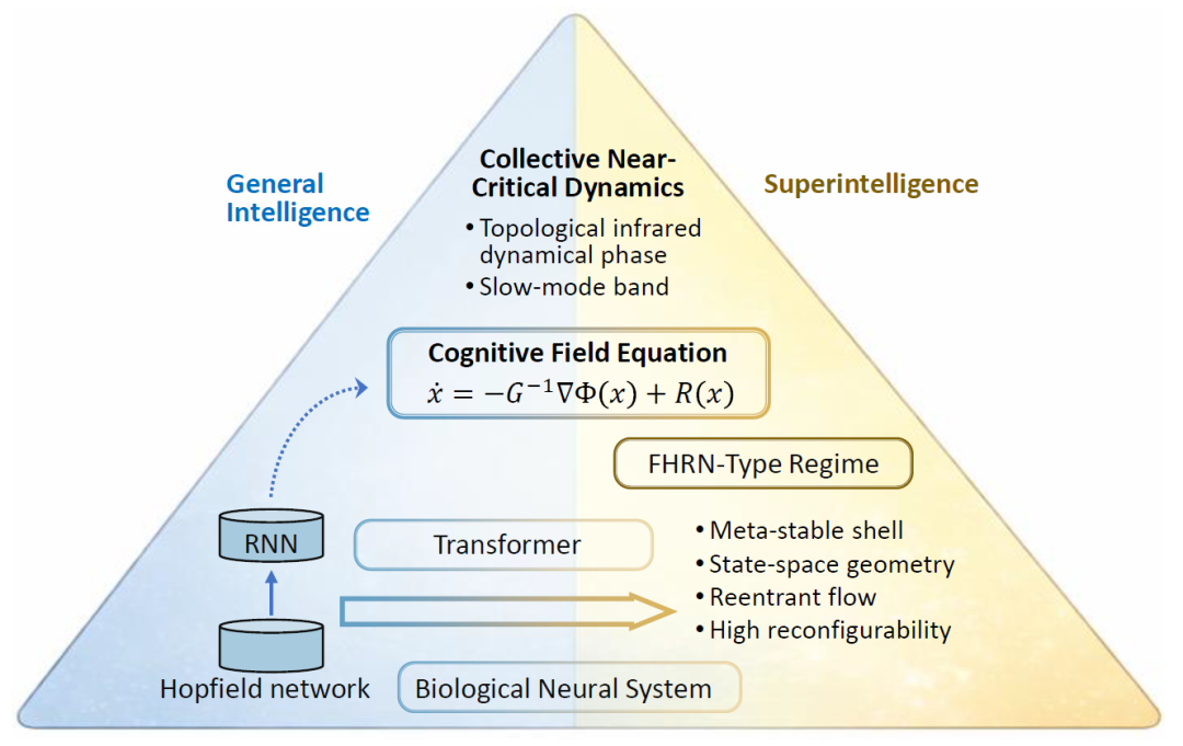 从下往上看,Hopfield网络、RNN、Transformer,甚至人类的生物神经网络,都是这个统一场方程的特例;区别只在于,它们的稳态项和重入项的强度不同,最终进入的动力学相不同。而超级智能,不是一个新的方程、新的架构,而是这个方程能进入的、最高级的稳定动力学相。