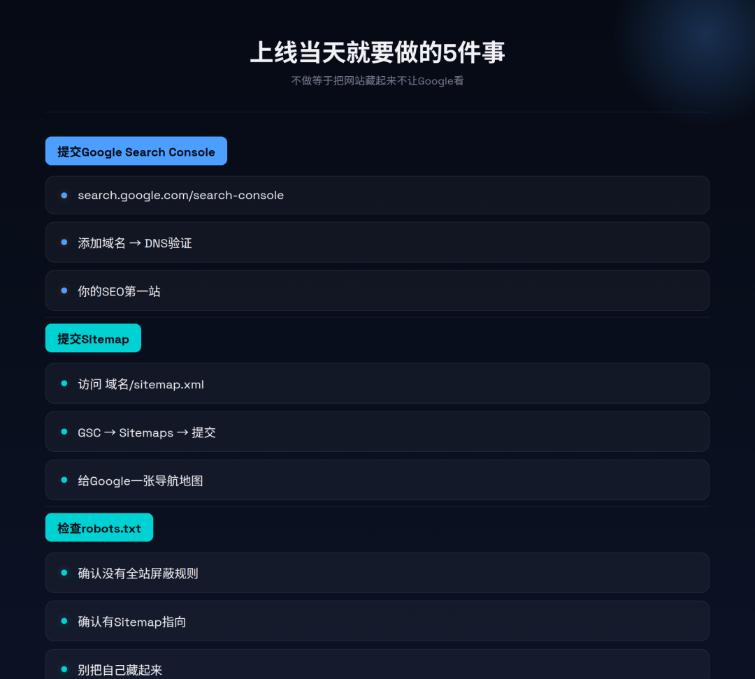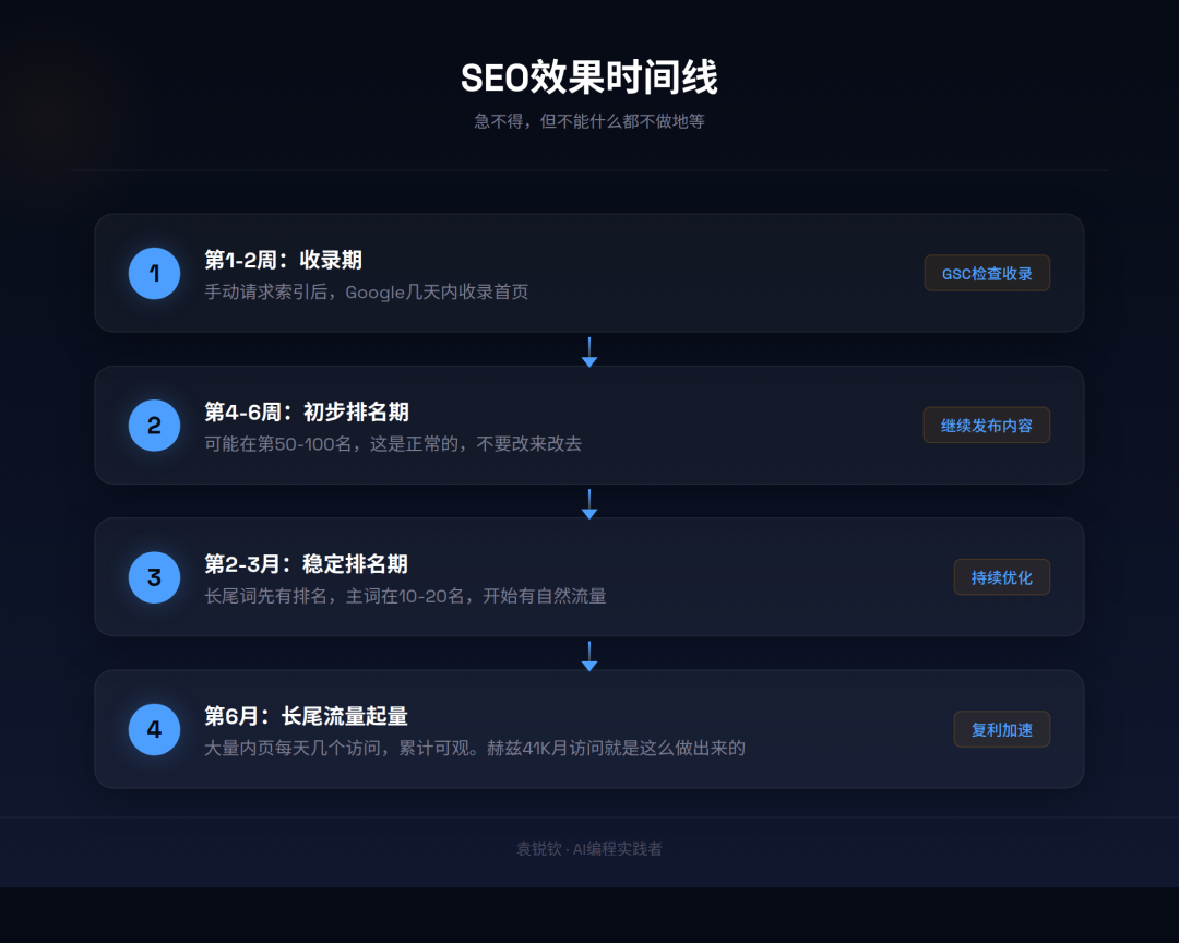 正确的节奏是:上线→提交GSC→发布内容→获取外链→每周检查数据→持续优化→等待结果。
