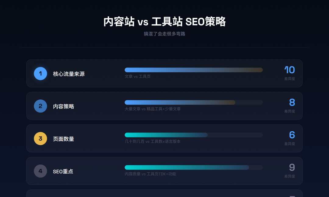 很多人学SEO,照搬的是内容站(博客)的方法论。但工具站的SEO策略和内容站完全不同。搞混了,会走很多弯路。