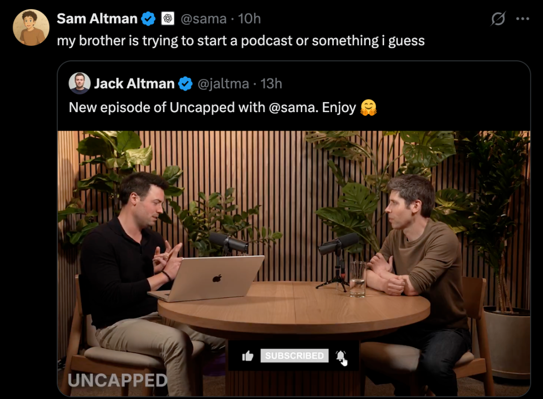 刚刚,OpenAI CEO Sam Altman 与他同样身处创投圈的亲兄弟 Jack Altman 进行了一场长达一小时的深夜对谈。