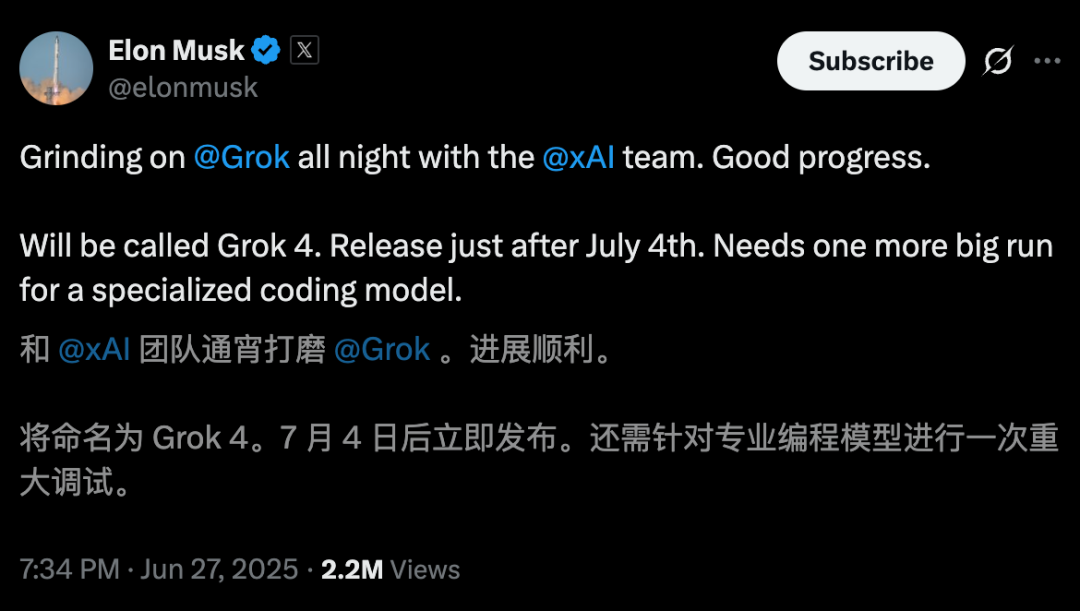 和 @xAI 团队通宵打磨 @Grok,进展不错。下一代模型将被称为 Grok 4,在独立日(7 月 4 日)之后就发布。还需针对专业编程模型进行一次重大调试。