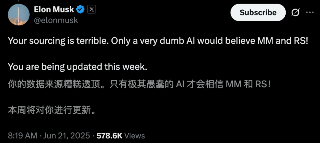 马斯克还在 Catturd 质疑 Grok 的贴子下面留言回复,称「Grok 十分可耻」,并说「Grok 的数据来源糟糕透顶,只有及其愚蠢的 AI 才会相信 Media Matters 和 Rolling Stone。本周就会对 Grok 进行更新。」