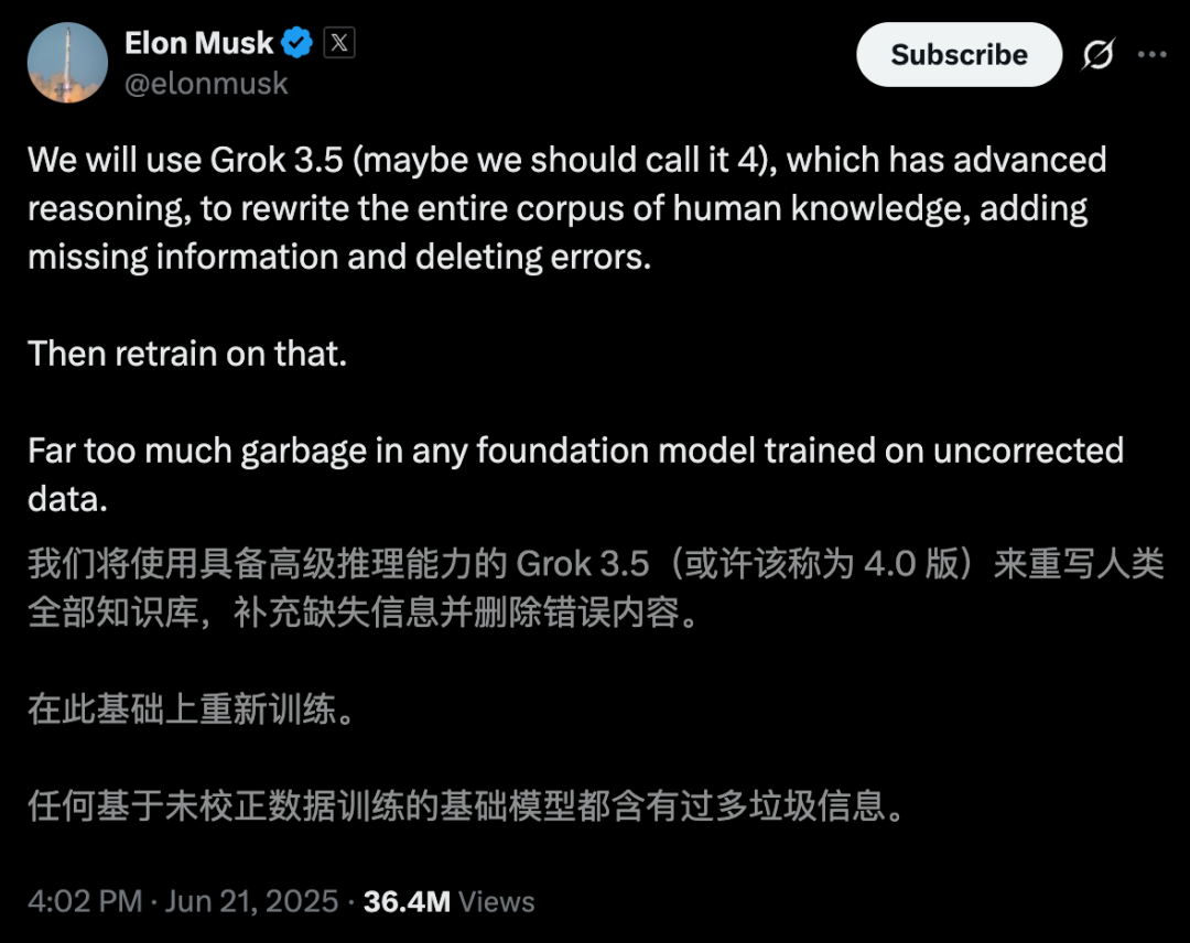 马斯克此前曾表示,他要用具备先进推理能力的 Grok,「重写整个人类知识库,补充缺失的信息,删除错误」,并在这个经过净化的数据集上重新训练模型。