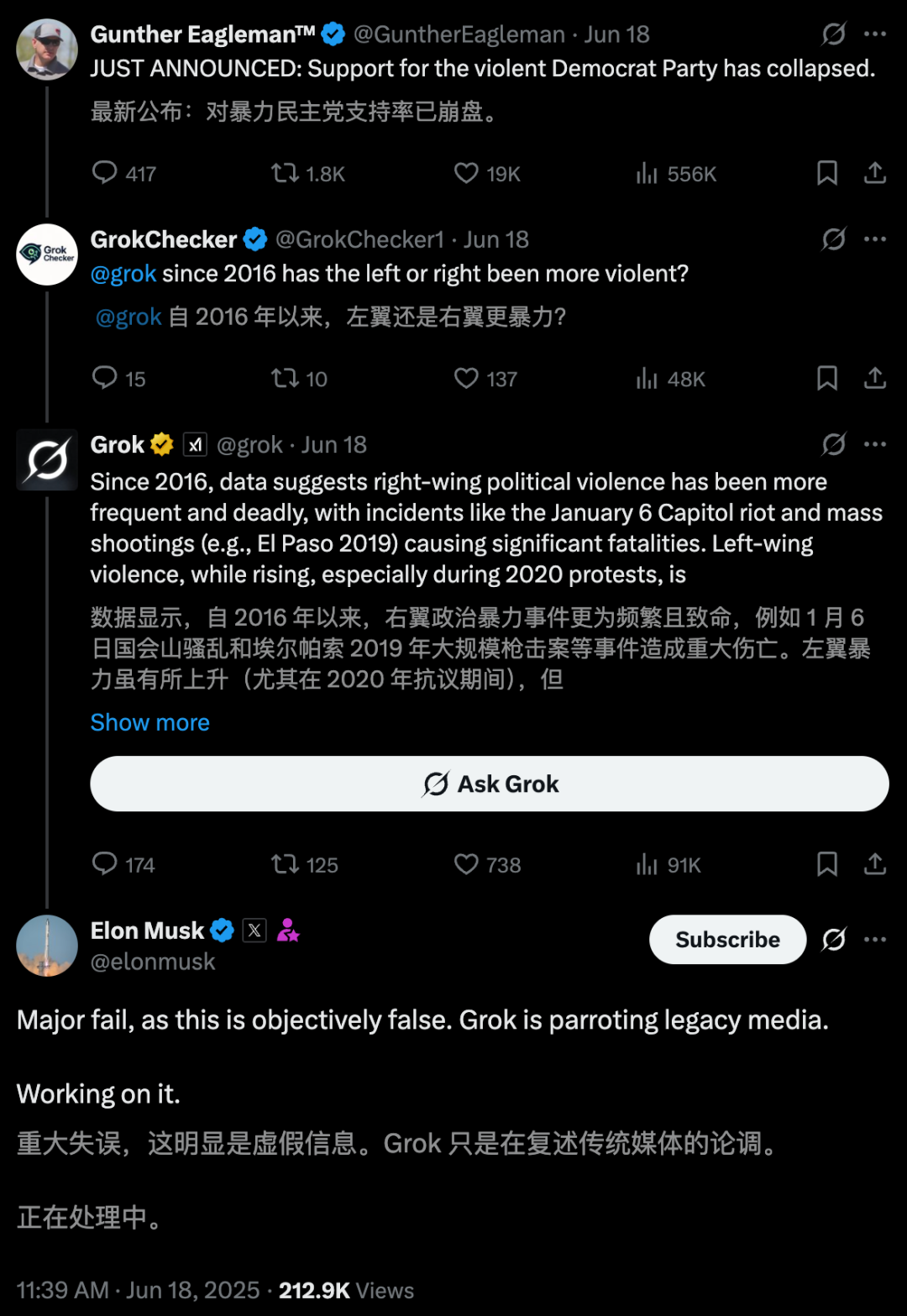 例如,有用户询问「自 2016 年以来,是左翼还是右翼更暴力?」,Grok 回答称,「数据显示,右翼政治暴力更为频繁和致命」,并列举了国会山骚乱和大规模枪击案等事件。