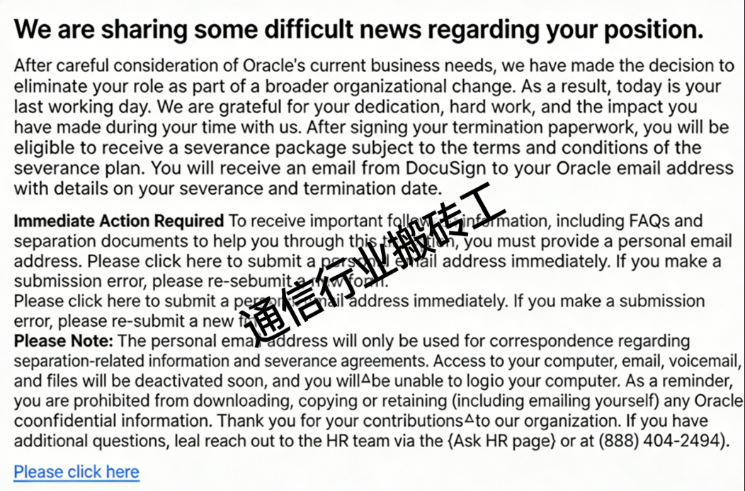 “经过审慎评估甲骨文当前业务需求,我们决定撤销你的岗位,此为公司整体组织架构调整的一部分。因此,今日为你最后工作日。”