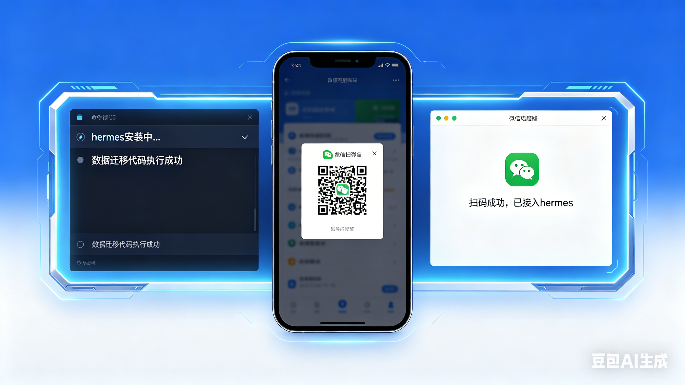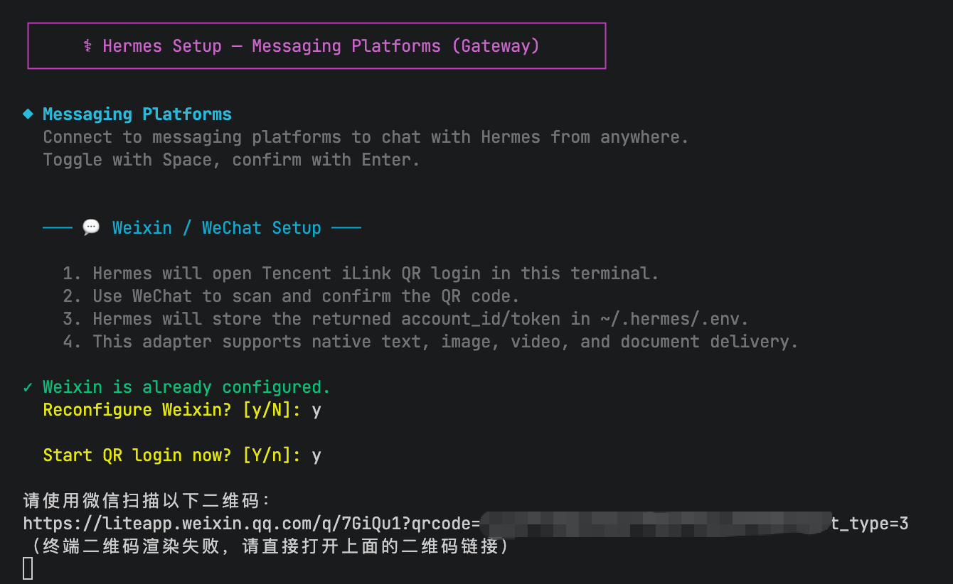 本来以为微信接入会很复杂,毕竟之前用其他工具对接微信,要么需要配置反向代理,要么需要申请企业账号,步骤繁琐到让人劝退。结果Hermes直接给我生成了一个二维码,提示我用微信扫码授权: