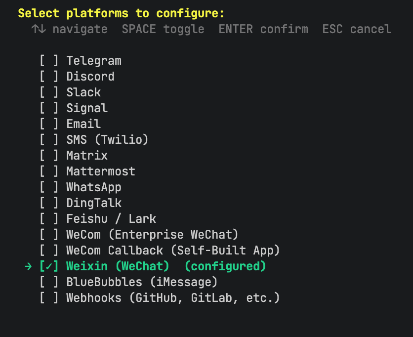 hermes setup gateway系统弹出了网关选择界面,让我挑选常用的接入渠道。