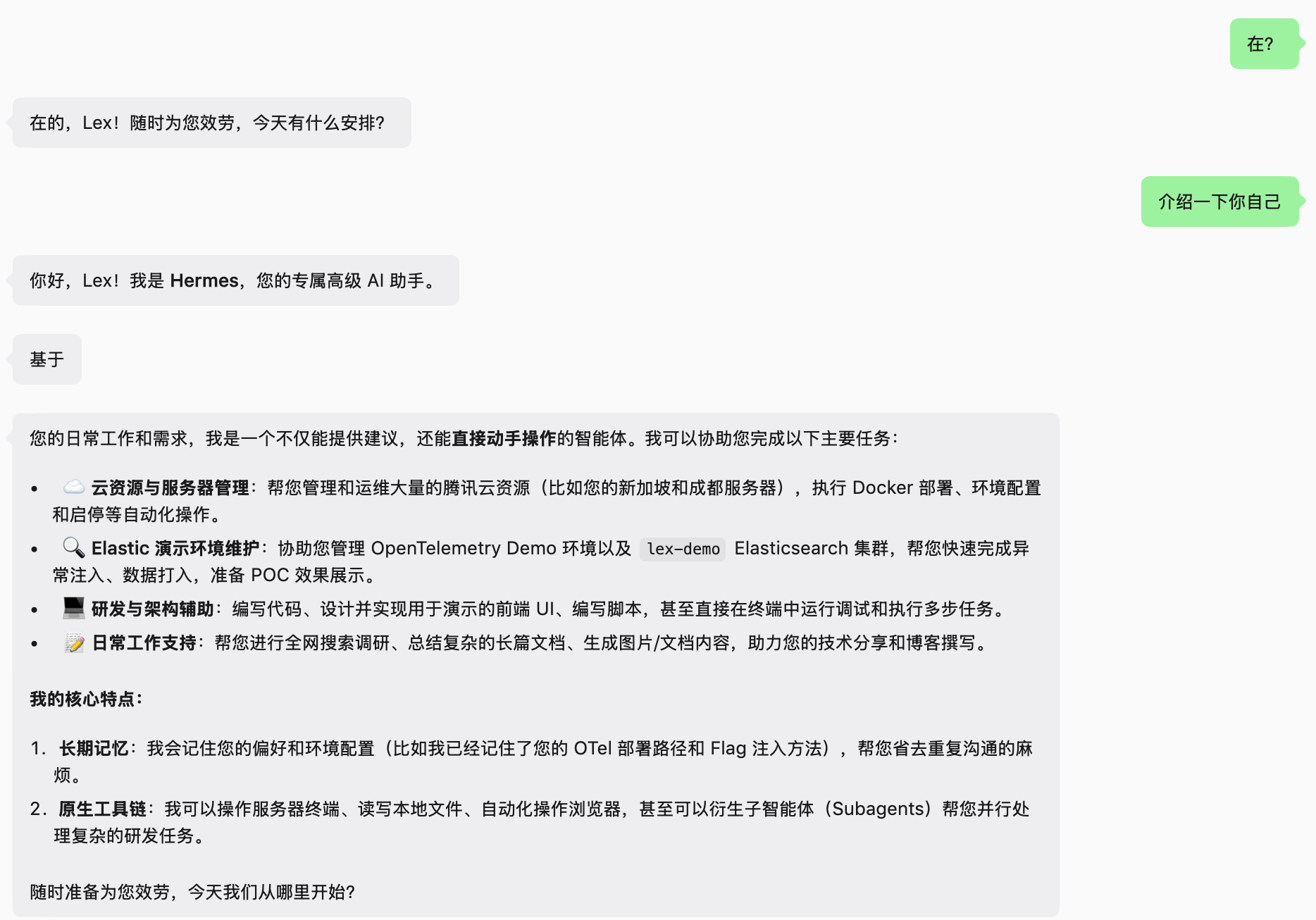 全程没有任何多余操作,不用手动配置token,不用调试接口,丝滑到离谱。那一刻真的有点惊喜,原来接入微信可以这么简单, Hermes这波原生支持确实戳中了痛点。