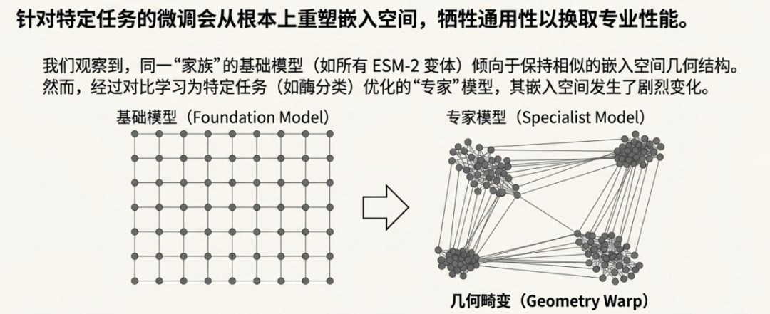 - 任务特异性训练扭曲几何结构: 针对特定任务(如酶分类或结构域分类)的对比式微调会从根本上重塑嵌入空间的全局几何结构,虽然能提高目标任务的表现,但会牺牲模型的通用性和跨任务泛化能力。