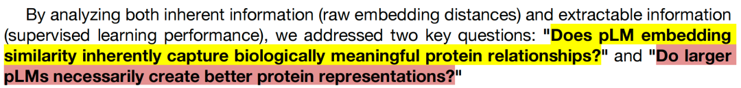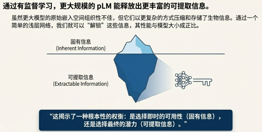 - 可提取信息容量红利: 尽管大型pLM的固有信息组织能力不一定更强,但它们在嵌入中编码了更丰富的蛋白质表征,通过后续的监督学习训练(可提取信息)可以显著提升性能,因此在需要精细调整以实现特定任务时,大模型具有优势。