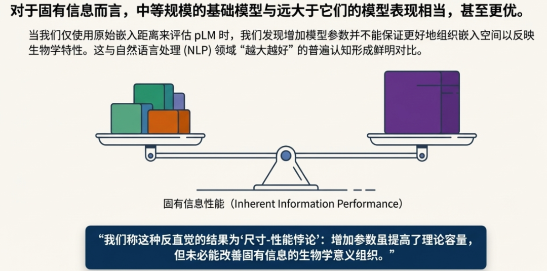 - 规模-性能悖论: 对于仅依赖原始嵌入距离(固有信息)的零样本(zero-shot)应用,中等规模的基础pLM即可达到性能的“甜点”,因为增加数十亿的额外参数并不会提高其内在的生物学意义的组织能力,且消耗更多能源。