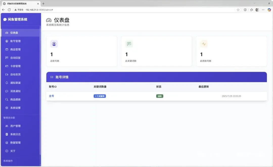 工具后台为可视化界面,各功能模块分类清晰,仪表盘可查看账号状态、消息统计、发货数据等核心信息,方便实时掌握店铺运营情况。