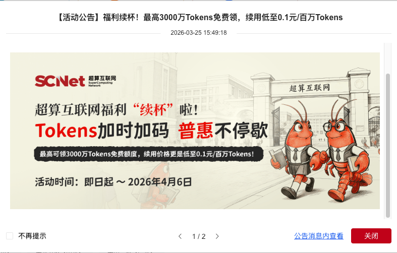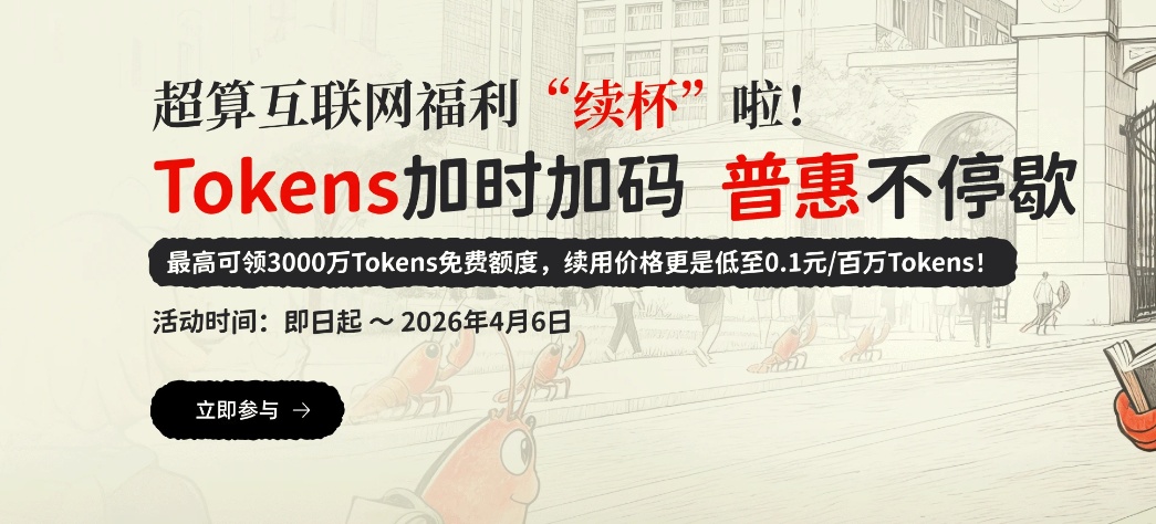 算力国家队放大招!国家超算互联网3月25日起开启限时福利,单人最高可领3000万免费Tokens,折算下来能处理4500万字的AI交互,还能薅0.1元/百万Tokens的特惠续用羊毛,有效期直逼4月6日。
