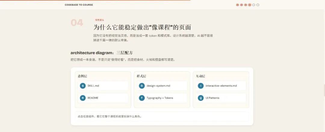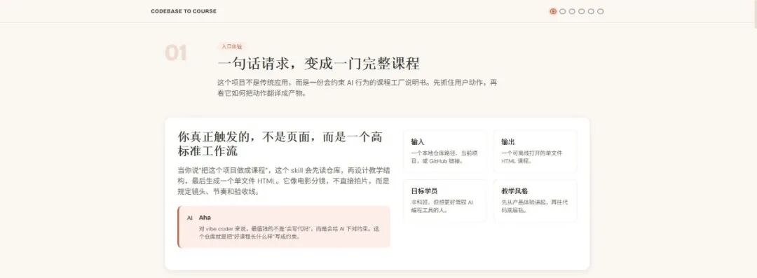 /codebase-to-course自动完成代码分析、结构拆解、内容组织与HTML渲染,生成course.html,浏览器打开即可使用。