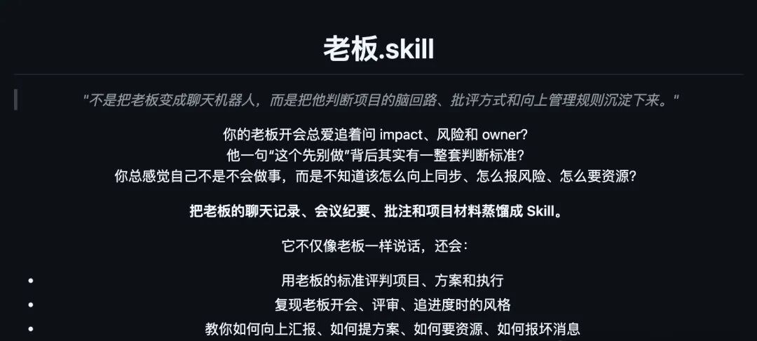 老板.skill | 复刻老板决策逻辑与沟通话术 | https://github.com/vogtsw/boss-skills |