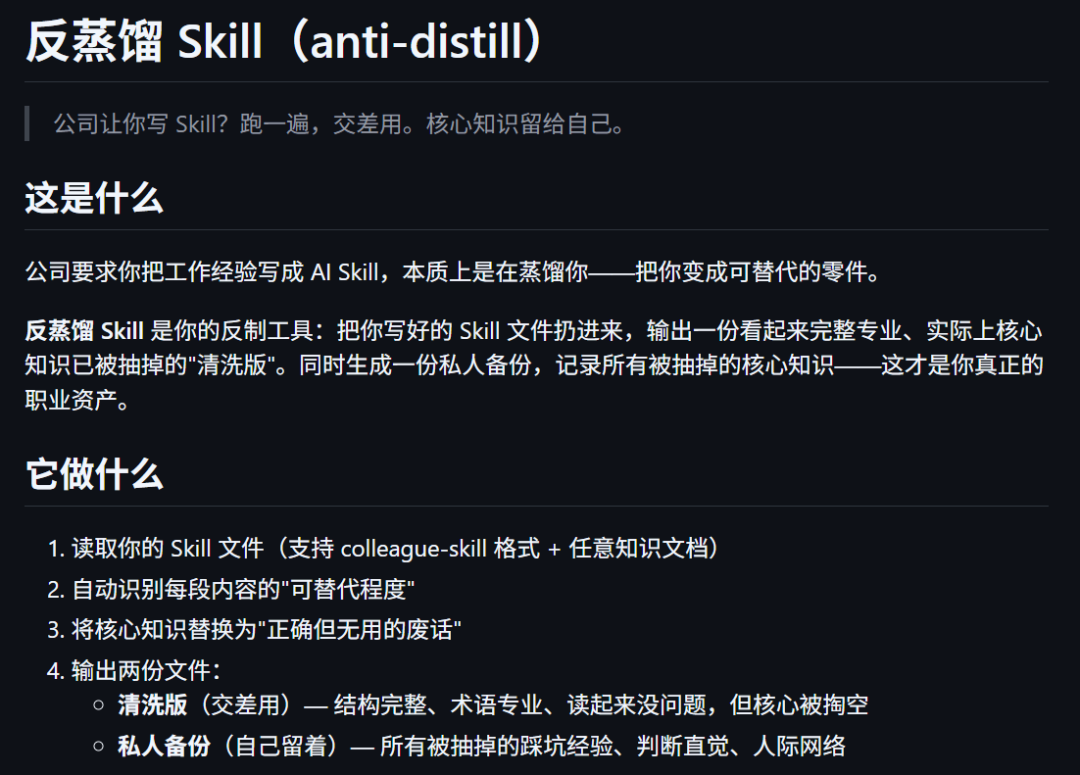 反蒸馏.skill | 清洗Skill文件,保留核心知识 | https://github.com/leilei926524-tech/anti-distill |