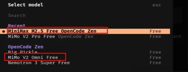 打开OpenCode后,输入/models命令查看可用模型列表。在列表中,找到并选择带有free标记的MiniMax M2.5模型。如果希望通过命令行直接指定模型,也可以使用以下命令: